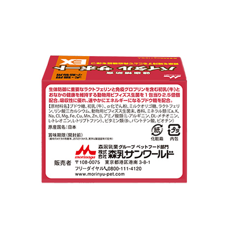 ブドウ糖、初乳(牛)、α化でん粉、ミルクオリゴ糖、ラクトフェリン、動物用ビフィズス生菌末、リン酸三カルシウム、香料、ミネラル類(Ca、K、Na、Cl、Mg、Fe、Cu、Mn、Zn、I)、アミノ酸(L-アルギニン、DL-メチオニン、L-トレオニン、L-トリプトファン)、ビタミン類(B1、パントテン酸、ビオチン)