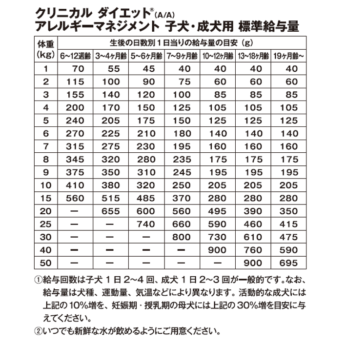 | 体重(kg) | 6~12週齢 | 3~4ヶ月齢 | 5~6ヶ月齢 | 7~9ヶ月齢 | 10~12ヶ月齢 | 13~18ヶ月齢 | 19ヶ月齢~ |